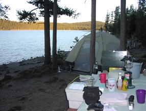 We left for Medicine Lake from my house around 4 in the afternoon. It is only about 2 hours from Klamath Falls to the campground, so we knew we could get settled in before evening. Mo pulled the sailboat with her Chevy van, but had a little bit of trouble with the hitch because it was too high to track properly until we added all the weight of our camping gear to the sailboat. We drove south to Tulelake and then west up the hill to the lakeside campground. We immediately found a great site on the north side of the lake on a rocky promontory by the water. It didn’t take long at all to set up our big tent and cook a great supper. The campsite wasn’t big enough to store the boat, so we parked it in the lot down by the boat launch about half a mile away on the east side of the lake.